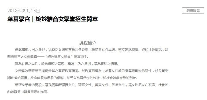 這個華夏學宮,不僅讓孩子讀《弟子規》,還專門開辦“婉妗雅音女學堂”,説是以“女德教育為社會良藥,為涵養女性家風……”