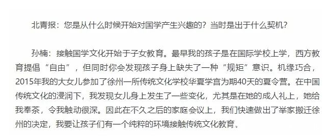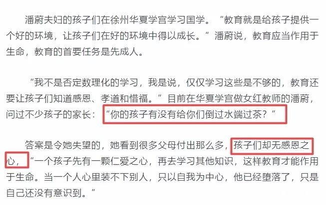 經過這個學習,孫楠和潘蔚夫婦是真心覺得這種國學有用,他們認為孩子的問題是“不懂感恩,沒有給父母端茶倒水,”所以“教育分首要任務是先成人”。