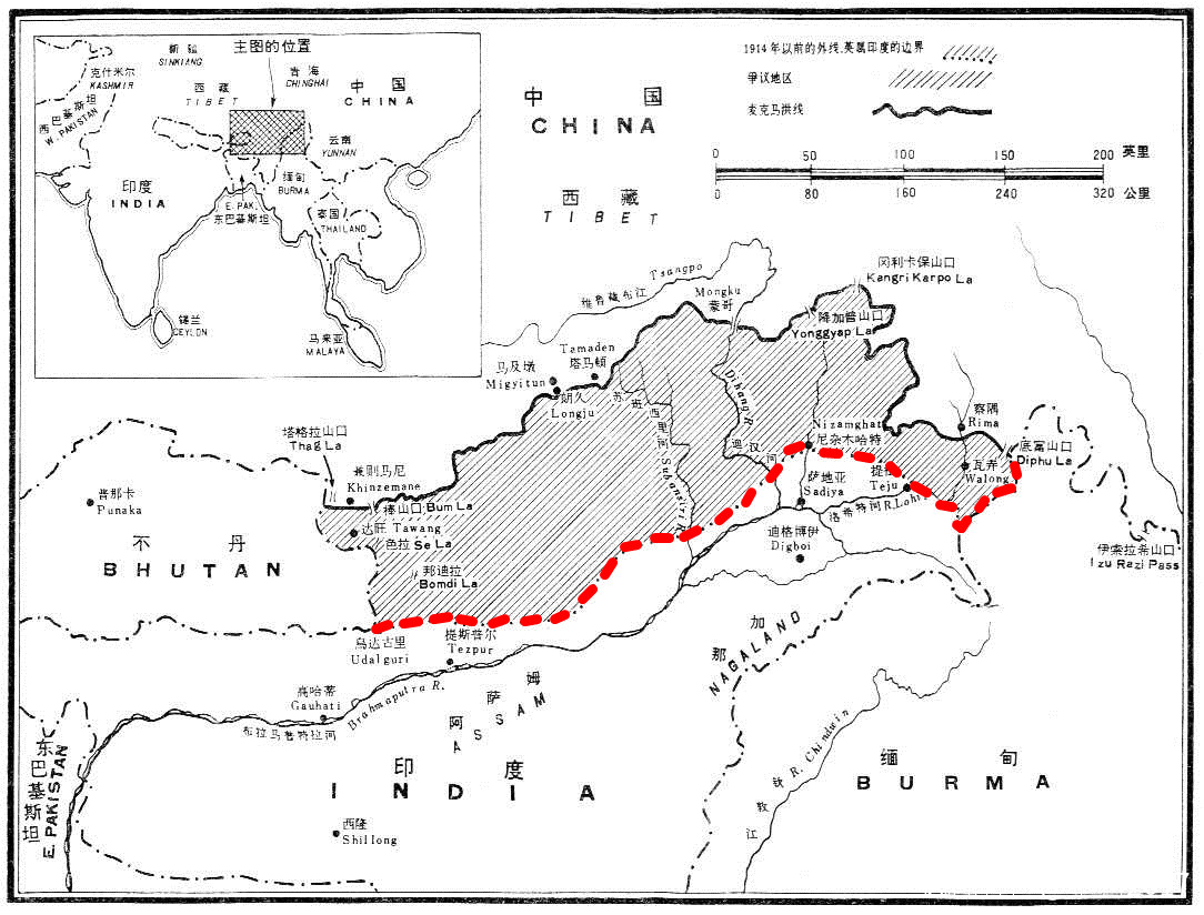 畫着這條邊界線的地圖清楚地表明,這條線絕大部分沿着西藏大高原的邊緣走,到了一個地方,地勢陡然變為崗巒起伏的地帶,逐漸向布拉馬普特拉河谷傾斜。根據地形特點劃的這條邊界線,在很大程度上也是一條種族分界線,因為西藏人一般地覺得他們的高原下面的潮濕河谷並不吸引人,就沒有在那裏定居下來。這個特點的顯而易見的例外是在邊界線的西端,它將達旺地帶切去了,而達旺地帶一向深受西藏文化的影響,不論從哪個意義講,都無疑地是屬於西藏的。