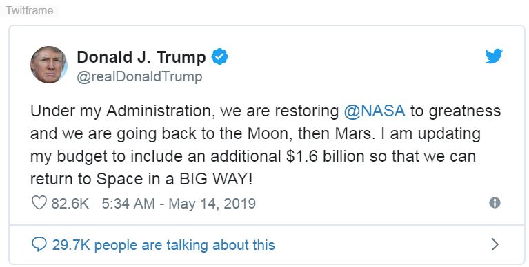 特朗普昨晚也首次提到了該登月計劃,發推特稱要為該計劃提供16億美元啓動資金。
