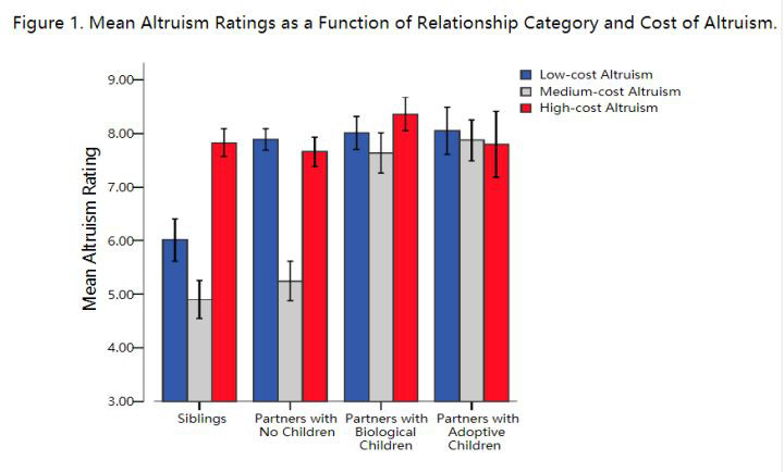 當我們是高代價無私的時候(比如生命危險的時候),我們往往更樂意幫助兄弟姐妹,除非是有了孩子的伴侶能夠勝過兄弟姐妹。其他的沒有孩子的伴侶,有養子的伴侶,在高代價的時候,都沒有辦法抵擋血脈的差異。