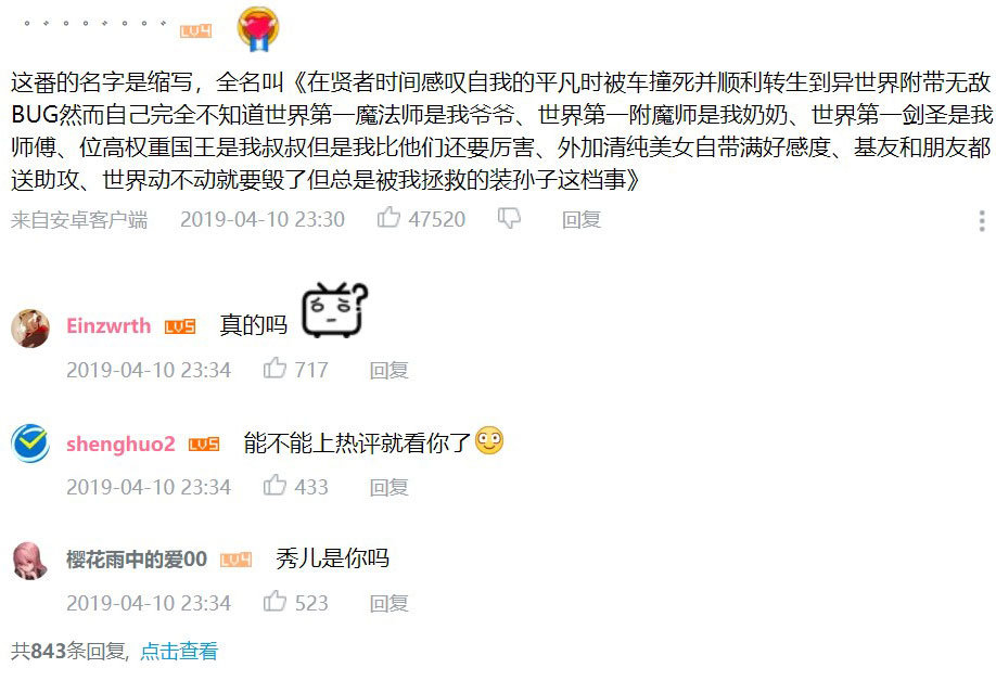 “這番的名字是縮寫,全名叫《在賢者時間感嘆自我的平凡時被車撞死並順利轉生到異世界附帶無敵BUG然而自己完全不知道世界第一魔法師是我爺爺、世界第一附魔師是我奶奶、世界第一劍聖是我師傅、位高權重國王是我叔叔但是我比他們還要厲害、外加清純美女自帶滿好感度、基友和朋友都送助攻、世界動不動就要毀了但總是被我拯救的裝孫子這檔事》”