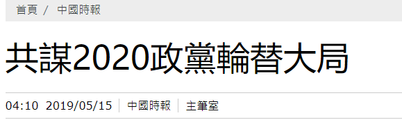 《中國時報》刊文《共謀2020政黨輪替大局》,文章指出,國民黨如今大爆發,民進黨已徹底失敗。為了台灣的未來,2020年蔡當局和民進黨必須下台,這已是全台灣民眾的共識和最大目標。
