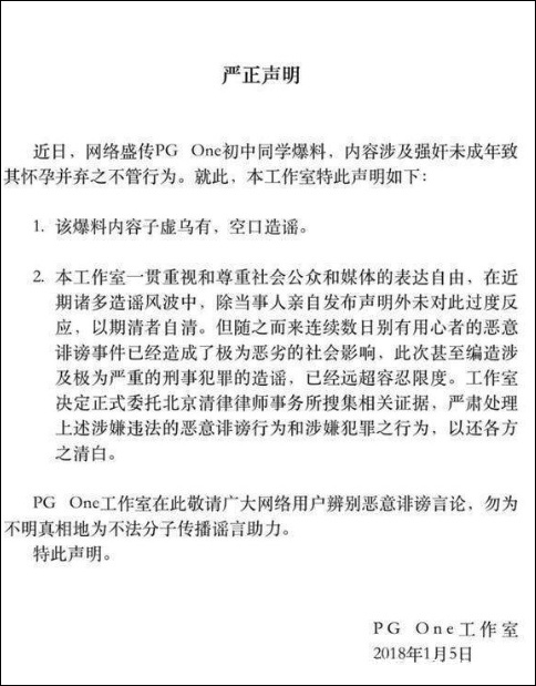 大家紛紛開始起底PG One黑歷史,發現這一段初中發小的事件應該是PG One在初中時就不負責任地讓女友懷孕的黑料,在當時被爆料是強姦未成年人。其工作室也發了聲明否認。