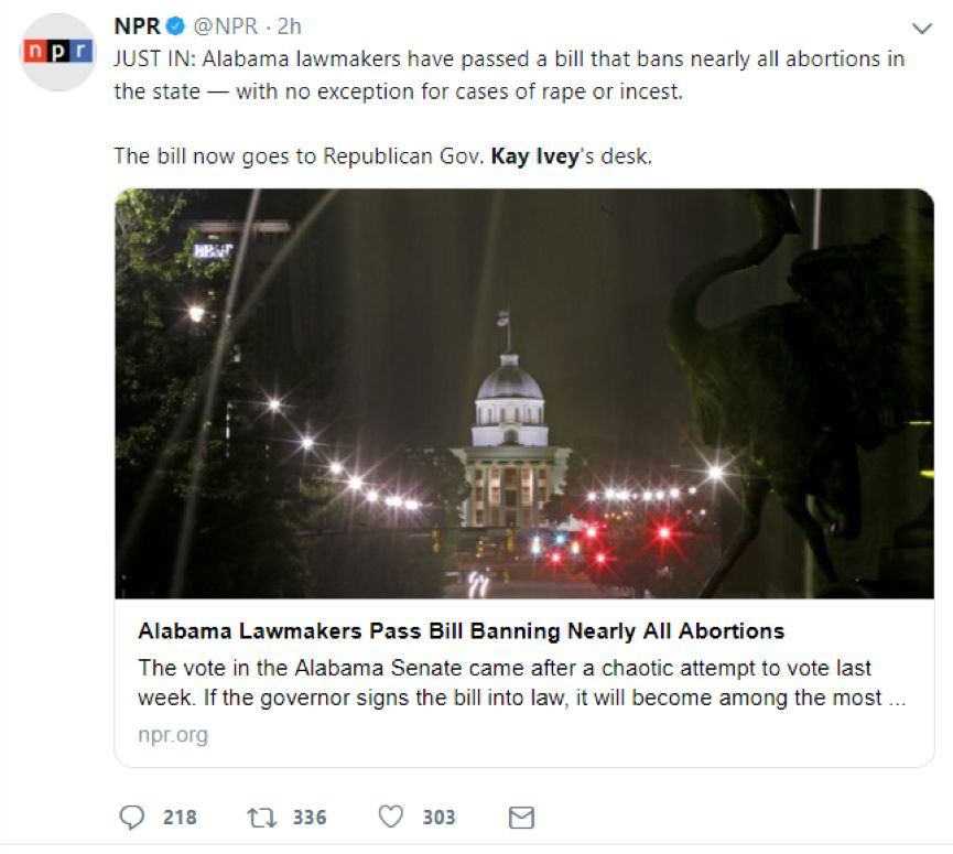根據美國媒體的報道,這項已經在美國引起眾多女性憤怒抗議和譴責的法律,是在繼前些天以74-3的得票數通過了阿拉巴馬州的眾議院後,於當地時間週二晚上(即北京時間今天上午)通過了當地參議院的。得票數是25票贊成,6票反對,1票棄權。