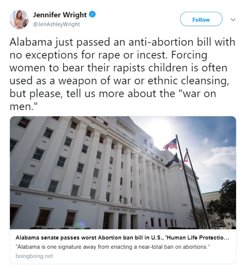 所以,這個法律目前已經在美國網絡上遭到了尤其是女性的強烈譴責和抵制。其中一名美國的女性作家甚至激動地表示“逼迫女性生下強姦犯的孩子通常是種族清洗中的一種做法”: