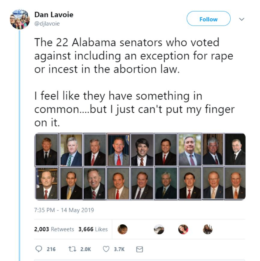 但有美國網友卻發現,持上述這種觀點、並最終拒絕允許被強姦女性的墮胎的20多名參議員,無一例外都是不用忍受生育之苦的白人男性…..