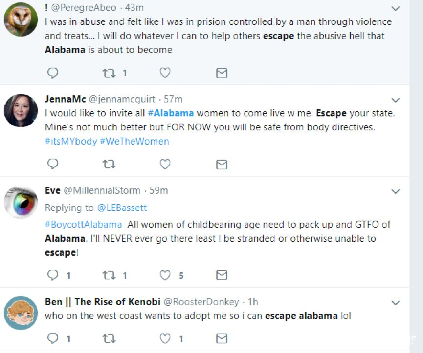 還有不少來自阿拉巴馬州的女性則表示他們將用腳投票,逃離這個可怕的地方:
