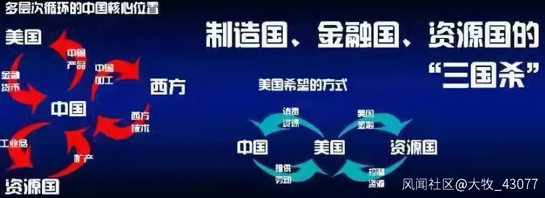 多層次的產業循環。圖左邊,中國處在一個核心的位置,就是美國的金融貨幣給中國,中國的產品給美國。西方有高技術到中國來,但是中國的低端製造的加工,返回西方去。西方它不是在自己加工能力,同時資源國的礦產給中國,中國的工業品給資源國。如果按照這個圖走下去,中國就可以迅速的強大。因為西方的這些技術,最後是難以為繼的,中國慢慢可以自己發展,自己的技術金融等等。中國在世界必然處在一個核心的位置。