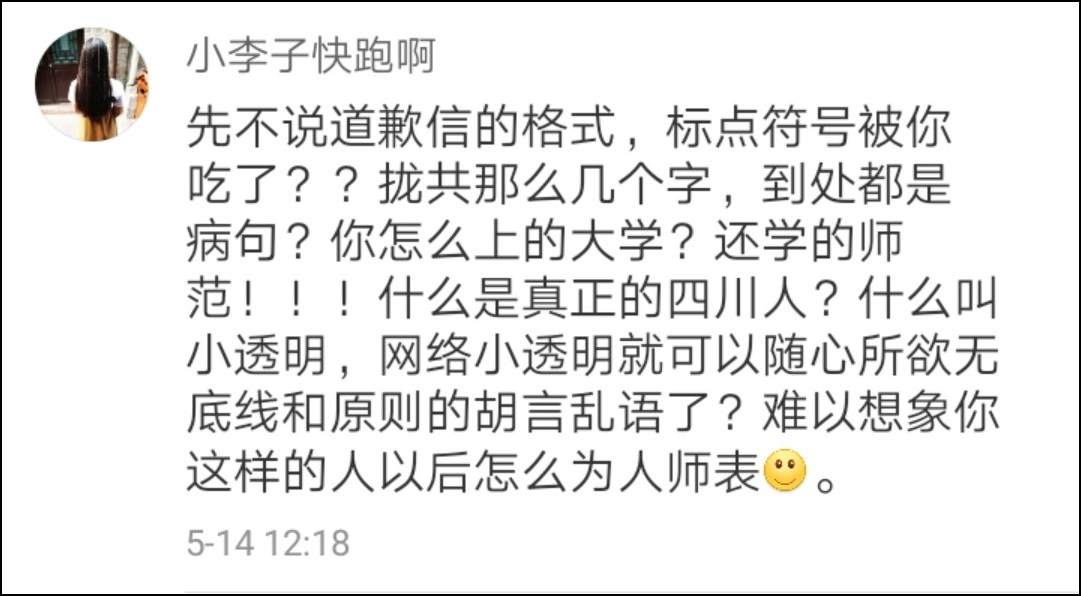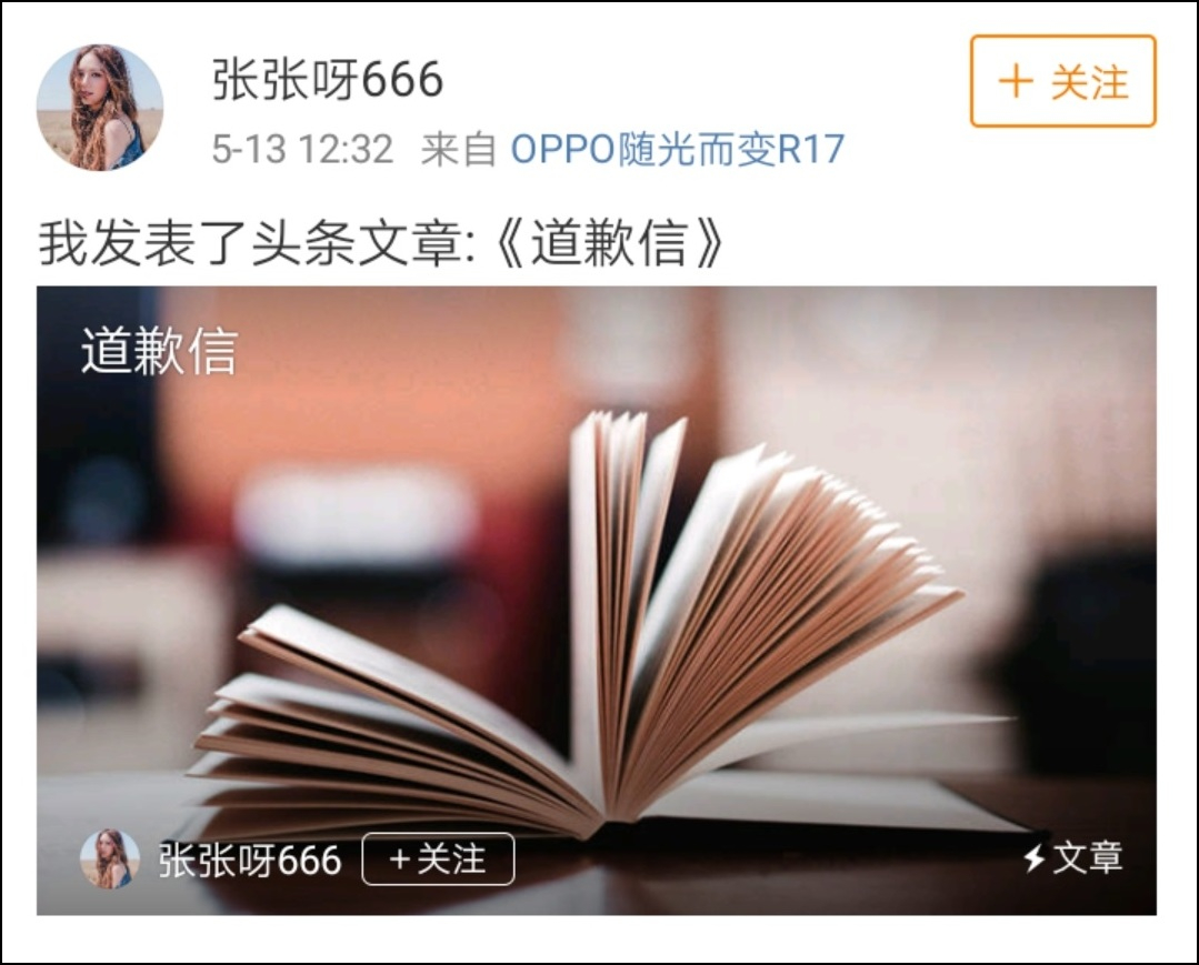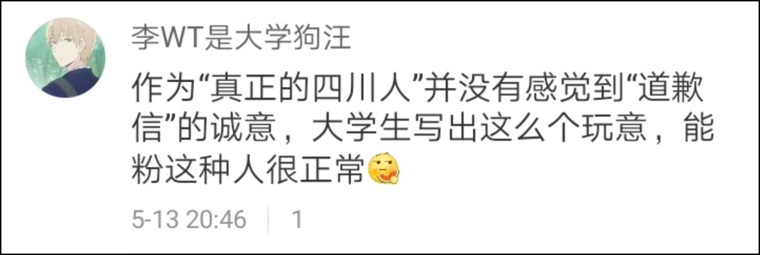 經過一上午的網絡口水仗後,@張張呀666 在當天中午發佈道歉信。她表示,自己就是喜歡張雲雷,和任何外在的事物都沒有關係。她也不認為,自己早前的發言有辱罵“真正的四川人”,只是由於氣憤説出了不正當的話語。