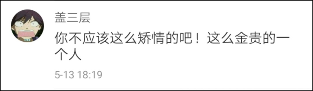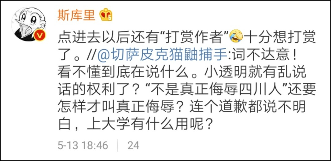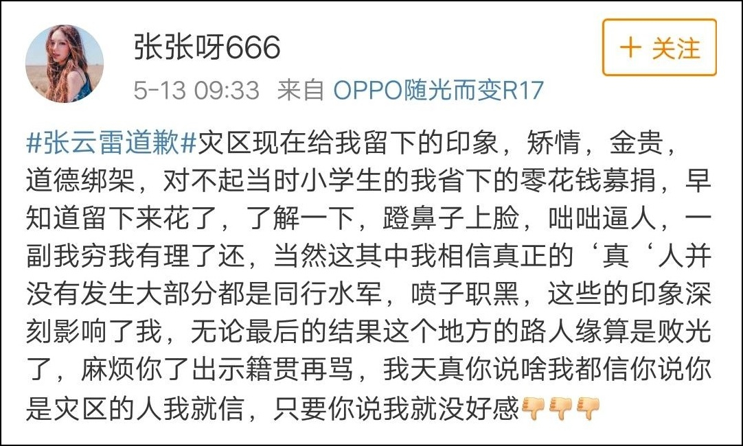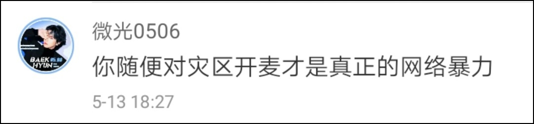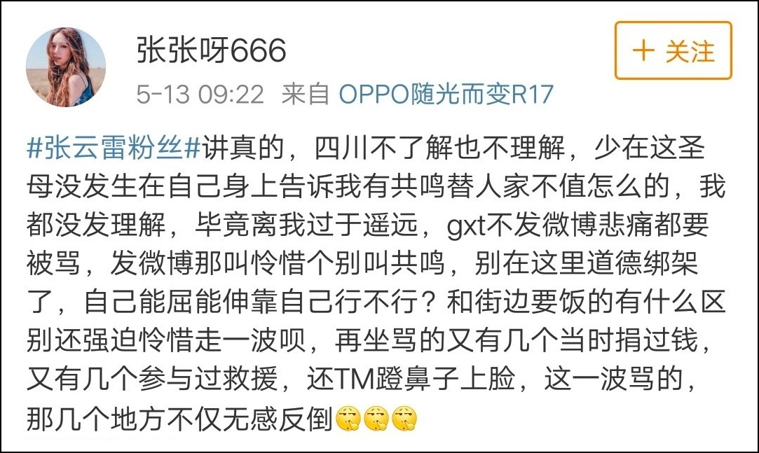 目前在社交媒體上還保留的截圖顯示,5月13日早上,在張雲雷道歉發酵之時,上述粉絲連續發文認為,批評張雲雷的網友是“聖母”,是在蹬鼻子上臉。不僅如此,她還認為“災區現在給我留下的印象,矯情,金貴,道德綁架,對不起當時小學生的我省下的零花錢募捐”。