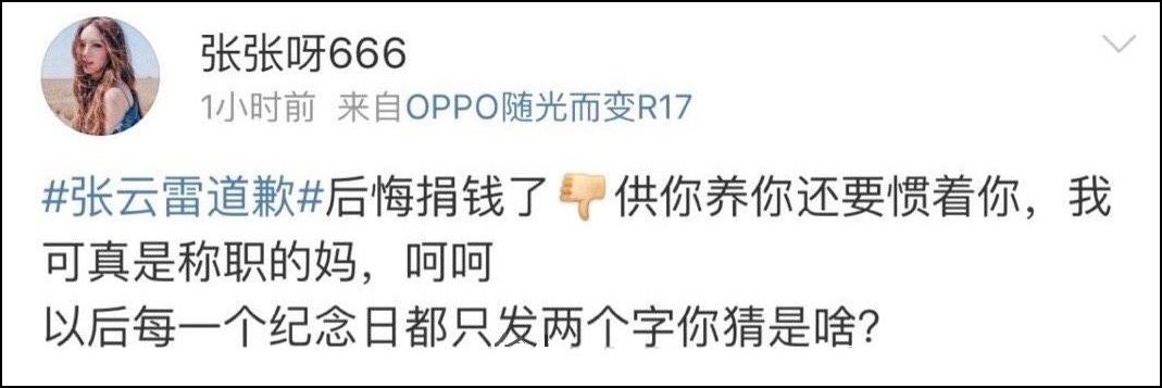 但是在這一過程中,張雲雷的粉絲們洗地姿勢千奇百怪令人感到詫異。其中一位被確認是“二爺”粉絲的網友@張張呀666 就大放厥詞,辱罵災區人民。經過網友一番批評教育後,她“被迫”道歉了!