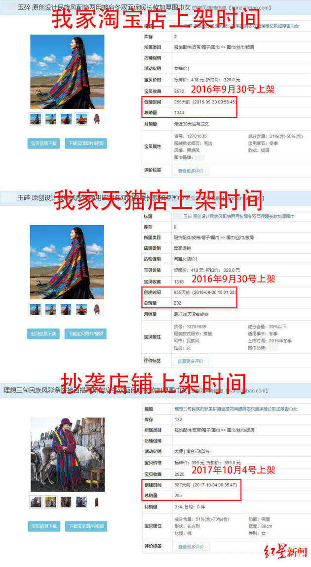龍小姐稱,她開了一家售賣原創服飾的淘寶店,她發現2017年8月,有名顧客在她店內購買過一件2016年上新的原創民族風披肩,而這個顧客的賬號和李先生的淘寶店掌櫃賬號也是一樣的。隨後,同年10月,李先生的淘寶店上新了同款服飾。