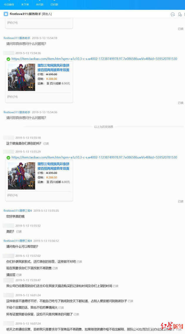 5月13日,龍小姐通過淘寶平台再次詢問李先生淘寶店客服,那一件民族風披肩是否是李先生淘寶店原創的,對方回覆“是的”。龍小姐隨後指出,該披肩是抄襲她家的款式,並要求對方下架商品不再銷售。