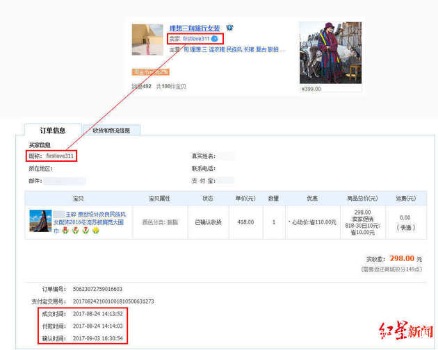 5月14日,小遲告訴記者,她新發現,2017年4月8日,一個在她店內購買那件涉嫌被盜版的原創服飾的賬號,和李先生的淘寶店掌櫃賬號是同一個。就在當天,又有一家淘寶店主龍小姐告訴記者,李先生也涉嫌抄襲她家的原創服飾。