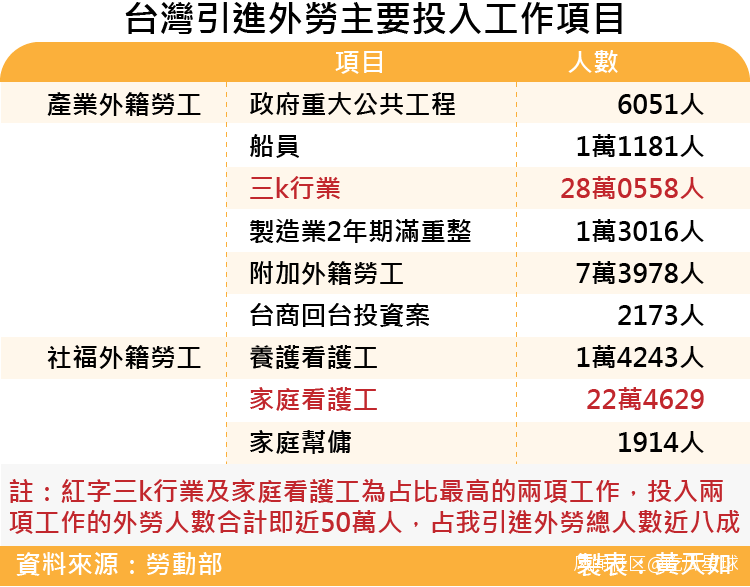 由圖可以看出,除了3K製造業,家庭看護工是外籍勞工投入第二多的工作項目。
