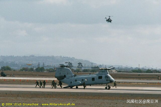 按照美軍的直升機作戰理論,在運輸直升機進行機降的時候,需要由飛行性能相似的“炮艇機”提前偵察着陸區的安全,在着陸階段則提供空中掩護,如圖中的CH-46“海上騎士”與AH-1Z“超級眼鏡蛇”的配合