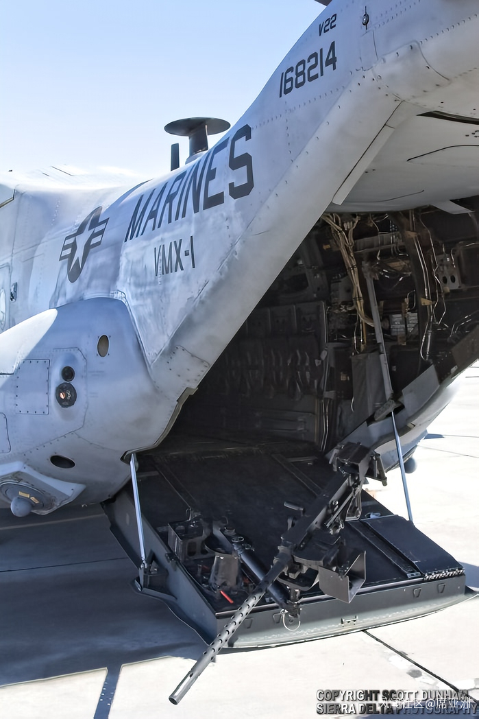 波音公司設計了一套複雜的“防衞武器系統”,在MV-22腹部下方安裝可以升降的遙控機槍,但沒想到,機槍發射的後坐力會傷及機體結構……所以不能這麼玩