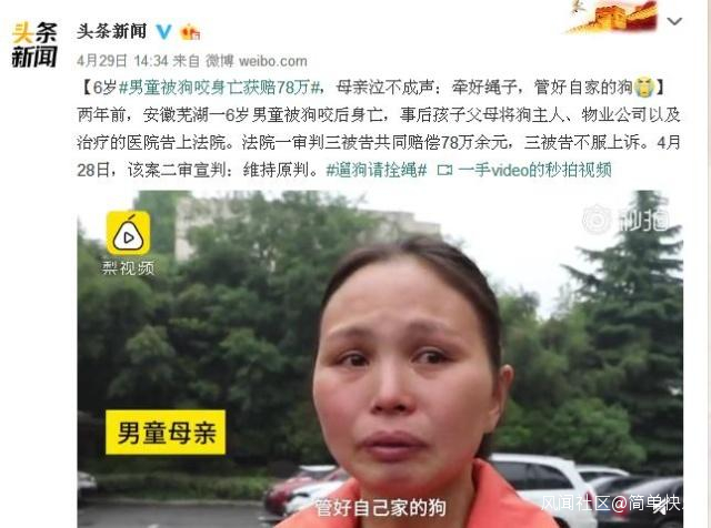 安徽蕪湖,6歲男童被狗咬傷後身亡。一朵尚未綻放的花,黯淡凋零,一個本來幸福的家,支離破碎,罪魁禍首,就是那條沒有拴繩的寵物狗。孩子父母將狗主、物業公司以及治療醫院告上法庭,被判處共同賠償78萬餘元。如果狗主不盲目自信“我家的狗不咬人”,如果狗主循規蹈矩遛狗牽繩,那麼,一切都不會是這個樣子,那孩子,依然快樂地活着,那狗主,不必胸懷人命的自責,那條狗,也不至於揹負惡犬的罵名。
