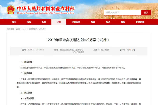 今年3月,農業農村部發布了《2019年草地貪夜蛾防控技術方案(試行)》(下稱“《方案》”),要求加強監測預警,分區重點防控,做好應急防控準備,確保早發現、早控制。