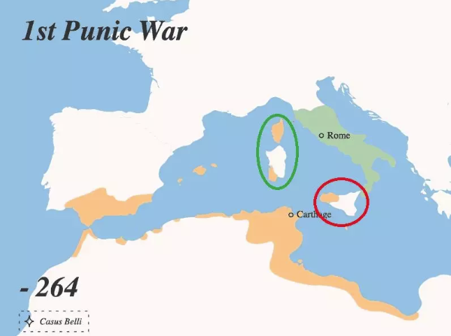 第一次布匿戰爭的起因非常俗套——兩個大國爭奪利益空間導致了摩擦,摩擦導致了戰爭。兩國的主要爭奪點,就是現如今意大利南部的西西里島。