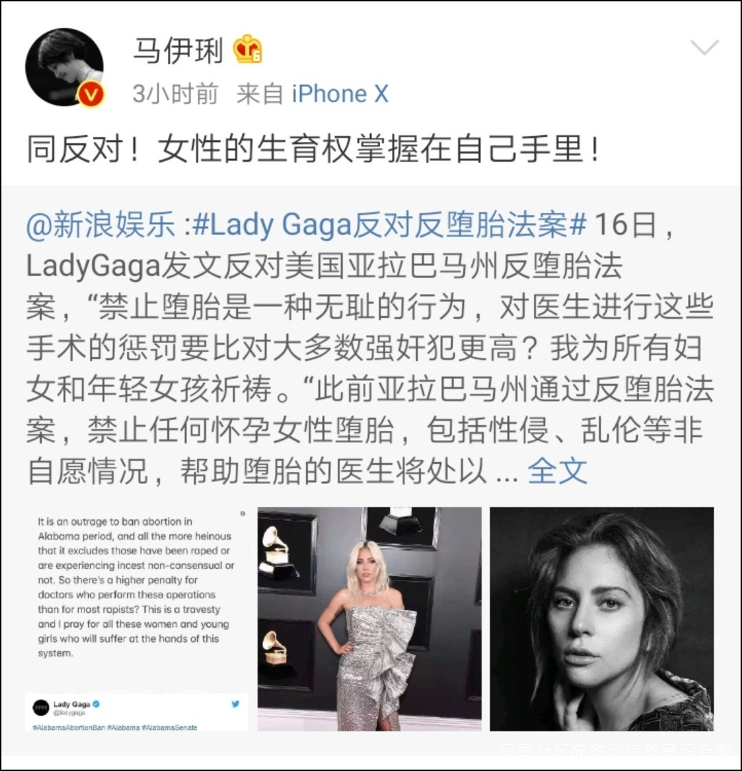 5月16日,馬伊琍在微博就Lady GaGa反對反墮胎法案一事發聲。馬伊琍轉發該條新聞時表示“同反對!女性的生育權掌握在自己手裏”。
