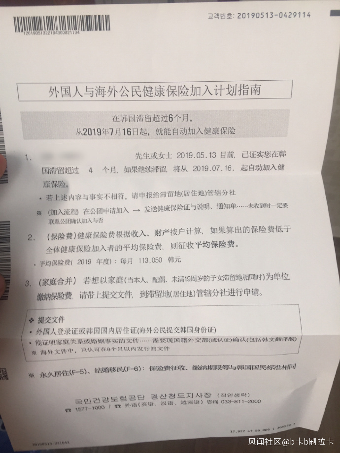根據這份《指南》健康保險費根據收入、財產按户計算,如果算出的保險費低於全體健康保險加入者的平均保險費,則徵收平均保險費。該平均保險費在2019年度為每月113050韓元,摺合人民幣653元,也就是每年需多出7836元購置保險。