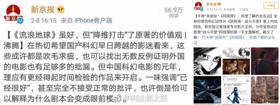 新京報刊登文章,貶低《流浪地球》“降維打擊”了原著價值觀,卻全然沒考慮過原著作者劉慈欣的感受。而當新京報面對《阿麗塔》時又是另一幅嘴臉。