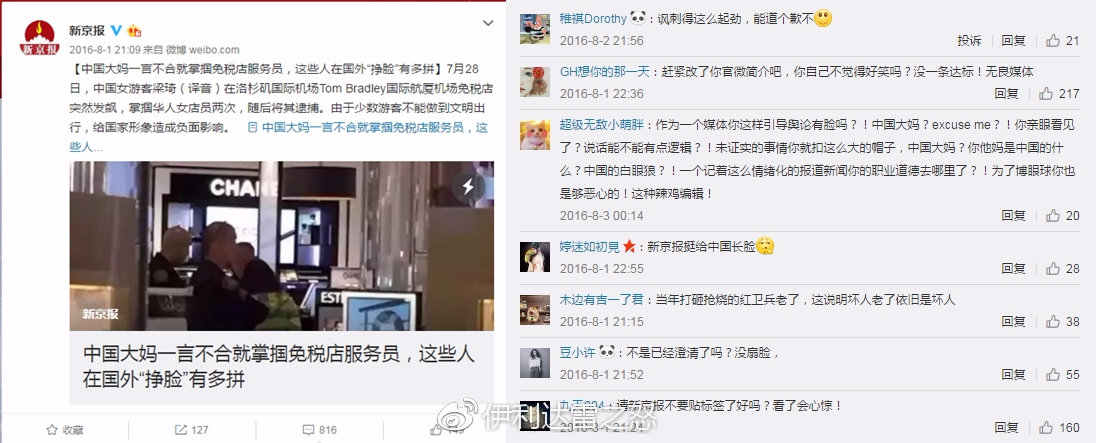 新京報曾經造謠某中國大媽一言不合掌摑洛杉磯某免税店服務員,引發網友對中國遊客在國外不文明行為的大討論。但是隨後就被闢謠: