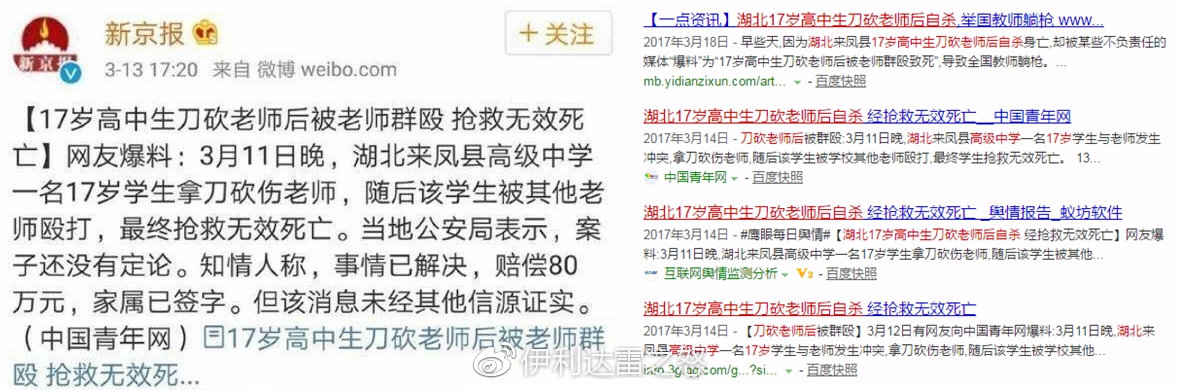 新京報報道某高中生刀砍老師後被老師羣毆搶救無效死亡。引發大規模討論,其中不乏對教育制度的抨擊和該校老師的辱罵,結果隨後反轉,該高中生是自殺身亡,並無“老師毆打”情節。