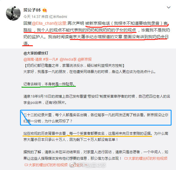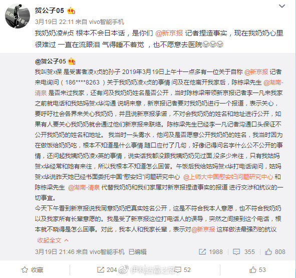 隨後,慰安婦之一的孫子賀某上微博表示“並未授權”、“報道出來以後有回訪,當時在忙接到回訪電話稀裏糊塗答應授權”、“編造了一部分內容”等。