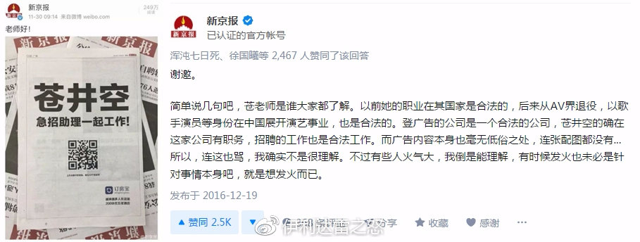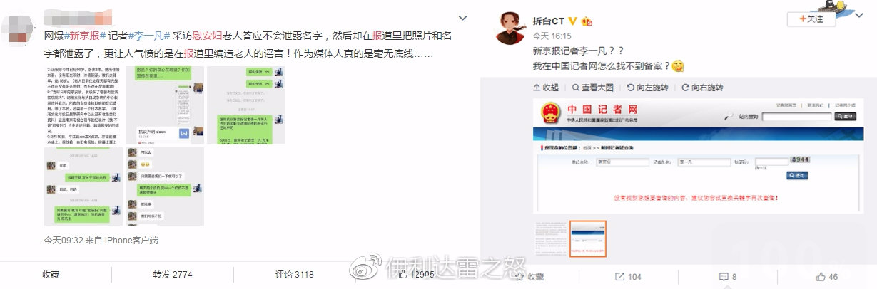 前日,某網友控訴新京報違背受訪者意願,公開了慰安婦的姓名和家庭住址,捏造大量內容,為受訪者帶去巨大壓力。在面對受訪者質疑時拉黑了受訪者的微信。而新京報發佈公告稱已獲得受訪者授權,對拉黑他微信的記者批評教育。但是馬上又有網友扒出,該記者並未在記者網備案,疑似“臨時工”。