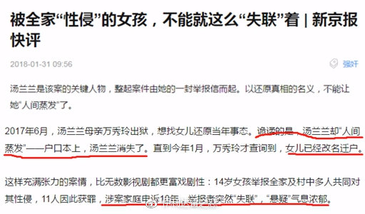 根據判決顯示,2008年,龍山村發生了一起輪姦案,不滿14週歲的少女湯蘭蘭先後多次遭到10餘名親屬和村民強姦,2010年,這些嫌犯們被判刑。這樁案子前後歷經四年,而新京報,只用了幾天時間,單方面採訪了剛出獄的罪犯們,就覺得自己掌握了真理,用如此聳人聽聞的題目,並且在新聞報道內容中各種暗示甚至名示受害者是個把親友誣陷進監獄的“惡魔”,並且有意無意中鼓勵大家人肉受害者。