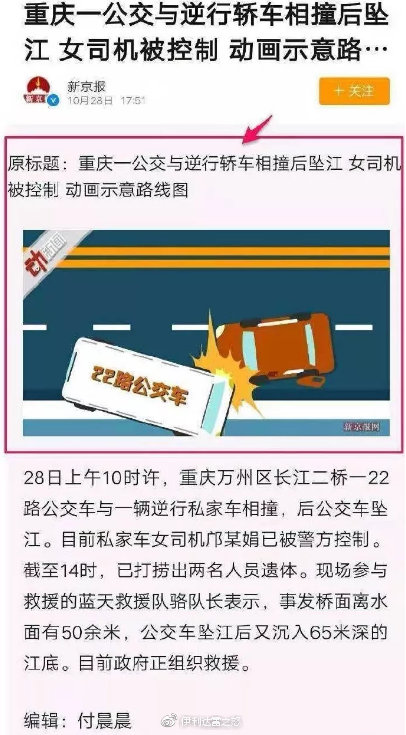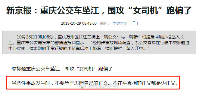 10月28日,重慶大巴墜江案發生後,在未有任何官方信息發佈時,新京報等媒體集體炒作虛假新聞稱事故是由於小轎車逆向行駛所引發的。並且配上“女司機穿高跟鞋坐在路邊”的圖片,將輿論引導向對“女司機”的討伐。