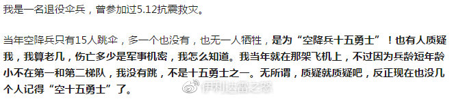 而當事人之一指出,空降兵15人跳傘,無一犧牲。
