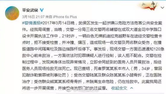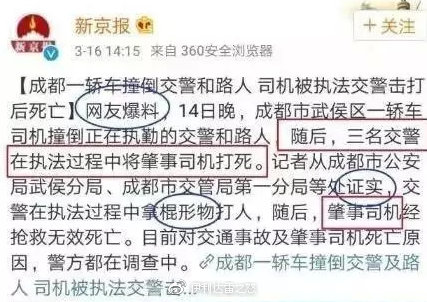 新京報曾以“網友爆料”的口吻,造謠交警在執法過程中用棍形物毆打肇事司機致死。隨後被平安武侯闢謠,原來是肇事司機在衝卡過程中造成交警和羣眾受傷,在被控制的過程中身體異常搶救無效死亡。