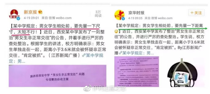 新京報曾以極端猥瑣輕佻的標題造謠某中學校規。稱“某中學男女學生相處前,要先量一下尺寸,太短不行”。