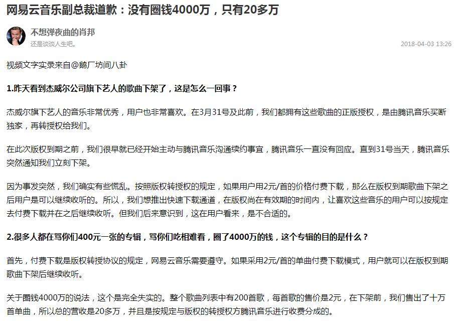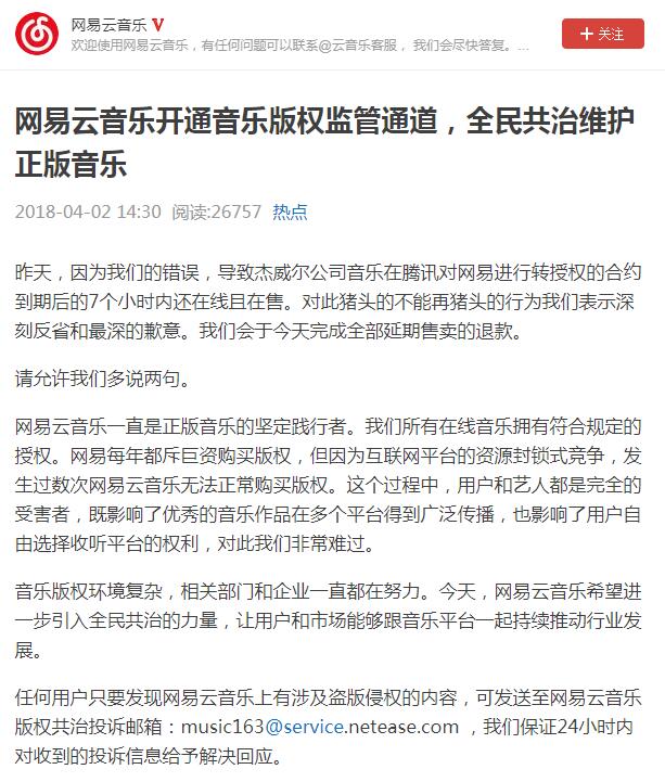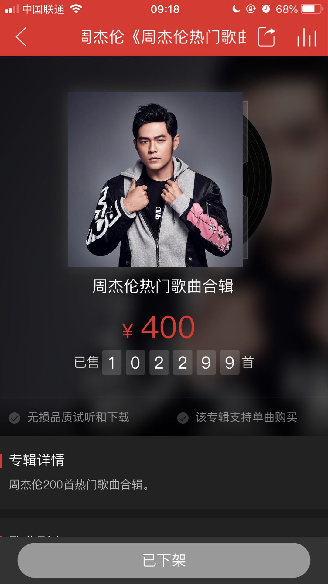 2018年3月31日,網易雲音樂與周杰倫所在的傑威爾版權公司合作到期,在版權即將遠去的情況下,網易雲祭出了“400元周杰倫熱門歌曲合輯”的騷操作,試圖藉着周杰倫版權的餘温最後撈一筆。