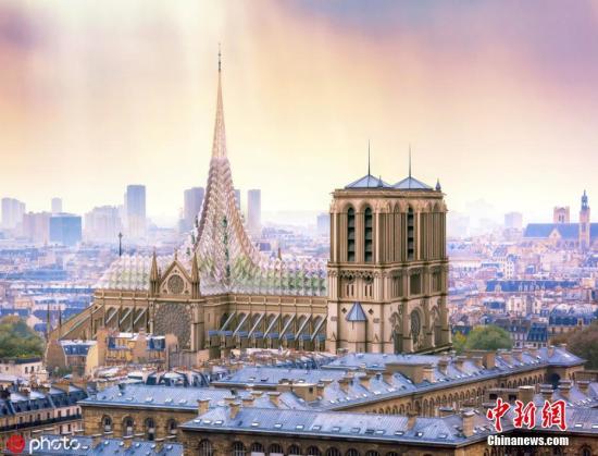 資料圖:巴黎聖母院的塔尖被大火燒燬之後,許多建築師提出了重建方案。