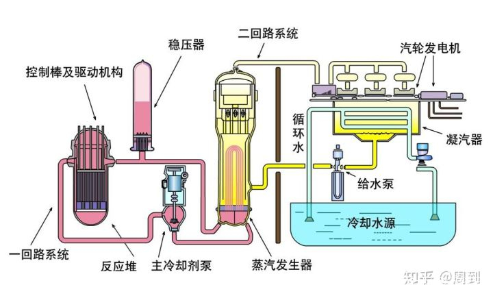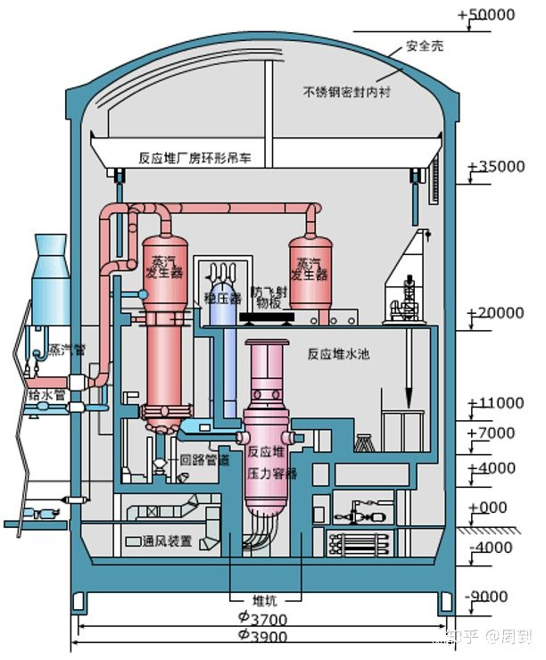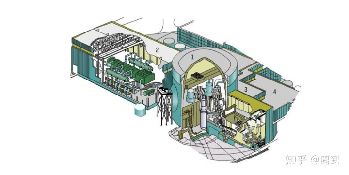 對於壓水堆,首先上圖的1(半球形頂蓋的圓柱形建築)叫做安全殼,這是壓水堆的第三道安全屏障,即使發生大規模泄露也能控制在安全殼內。