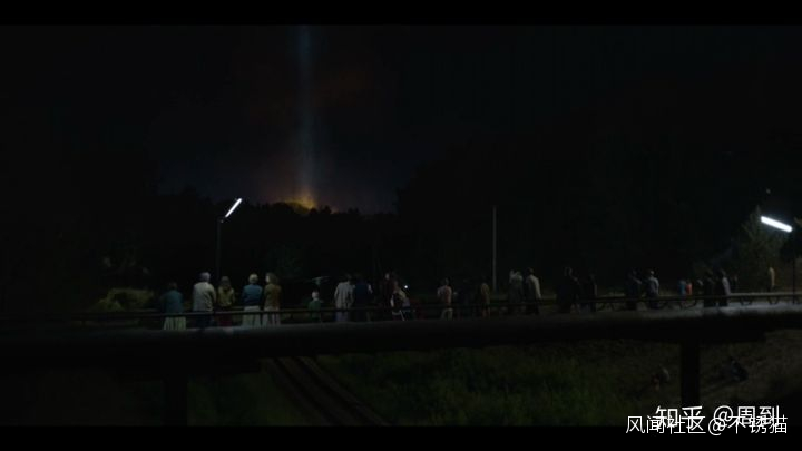 劇中這裏人羣圍在鐵路橋上看反應堆爆炸所發出的光,這件事在切爾諾貝利的時候是的的確確發生了,當然人們形容一束五彩的光照向天空。嚴格來説,這一道光是藍色的(劇中也是如此)。