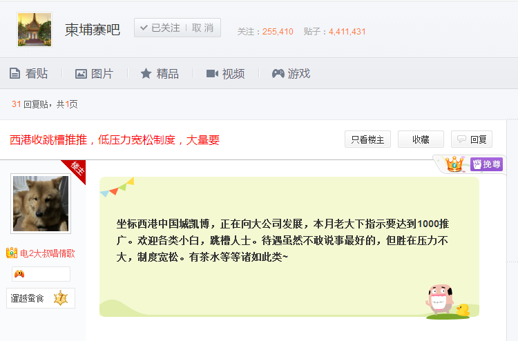 澎湃新聞記者遂以應聘者身份暗訪,有自稱在柬埔寨賭博公司工作的發帖者稱,他們在百度貼吧招募的人員主要從事“推廣”工作,即通過網絡聊天,多以談男女朋友為名,誘騙國內人員參與網絡賭博。