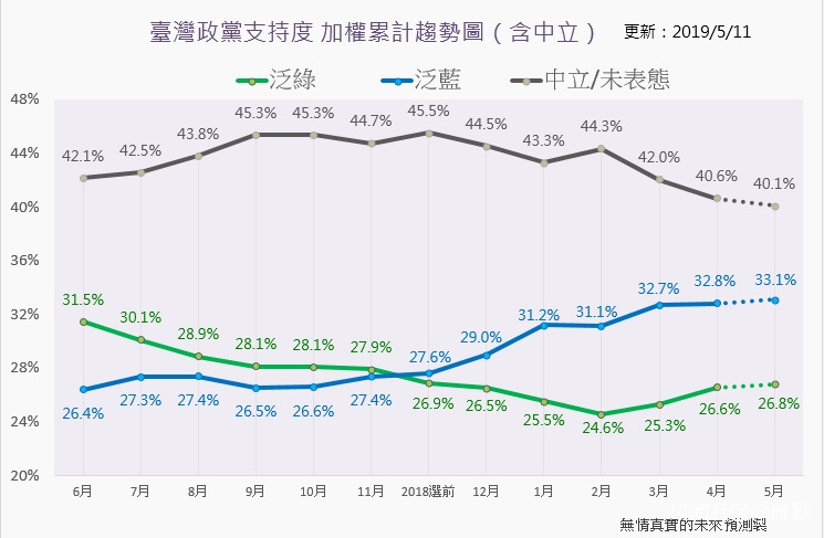 在「九合一」選後至今,泛綠支持度小升至27.7%。泛藍支持度大升至34%,中立選民則萎縮到38.3%。以大勢來看,藍綠支持度皆有向上趨勢,中立者則有明顯滑落的表現,換言之,藍綠歸隊正在發生,而又以3月份的反轉信號最為明顯。