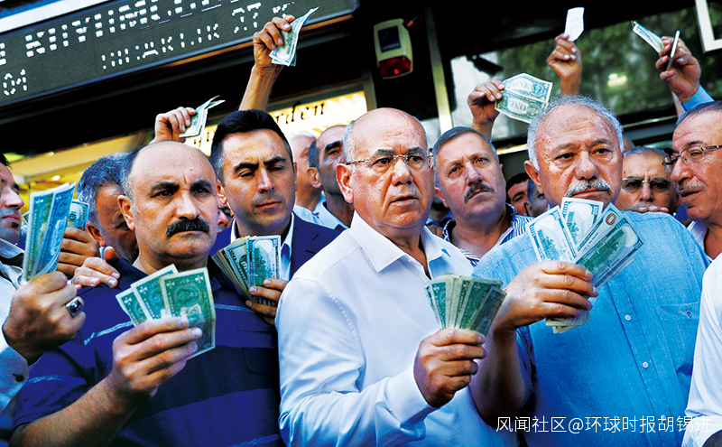 2018年,由於美聯儲加息導致國際遊資大規模迴流,美國對土耳其、伊朗進行制裁以及貿易保護主義的影響,俄羅斯、阿根廷、土耳其、南非等不少經濟體貨幣遭遇大幅貶值。圖為2018年8月14日,在土耳其首都安卡拉,人們響應政府號召,手持美元站在貨幣兑換處前,出售手中的美元支持本國貨幣里拉。 新華社/路透
