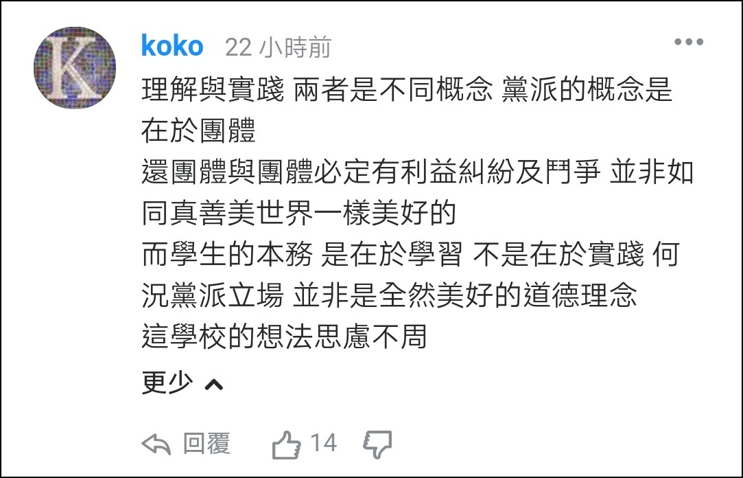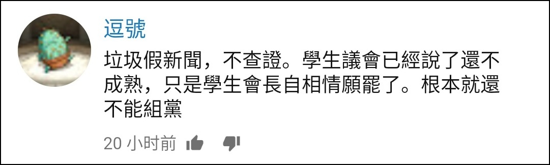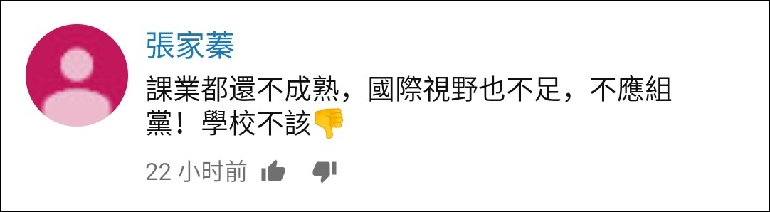 東海大學政治系教授沈有忠説:“因為我們也會擔心説,校園裏頭(組黨)會影響他們讀書,有可能在公共事務上面來講,在高中階段就形成對立,或者形成比較不理性的討論,這是我們不樂見的。”