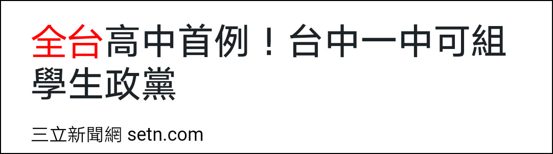 據台灣媒體報道,台中一中向來都以學風自由聞名,而在日前該校學生會又通過了《政黨成立及管理辦法》,開放學生可以在校園內成立“學生政黨”,成為全台首創。