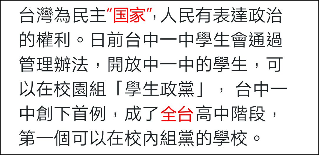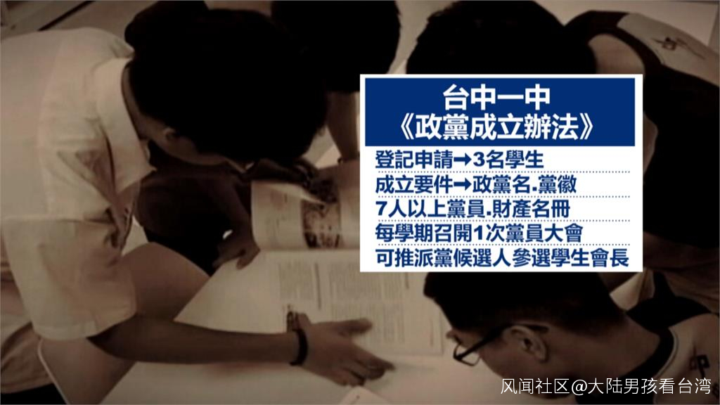 台灣媒體還報道稱,台中一中學風向來自由,校方也從善如流。目前校內自治團體,有學生會、學生議會跟學生評議委員會,高校生組黨,在全台首開先例。