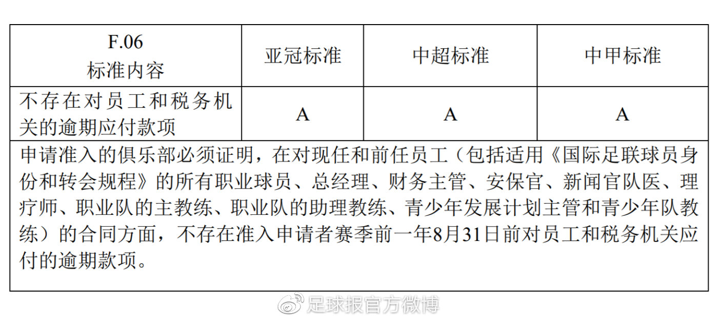 今年7月足協准入部將對各傢俱樂部進行工資確認,就算遼足隊員還是能夠提交工資確認表,年底在准入審核中大概還是會因為欠税而無法達標。根據《中國足協職業俱樂部准入規程》的規定,在准入條件的財務標準中,有一項A類條款是“不存在對員工和税務機關的逾期應付款項”,這一條的具體表述為“申請准入的俱樂部必須證明,在對現任和前任員工(包括適用《國際足聯球員身份和轉會規程》的所有職業球員、總經理、財務主管、安保官、新聞官隊醫、理療師、職業隊的主教練、職業隊的助理教練、青少年發展計劃主管和青少年隊教練)的合同方面,不存在准入申請者賽季前一年8月31日前對員工和税務機關應付的逾期款項。”