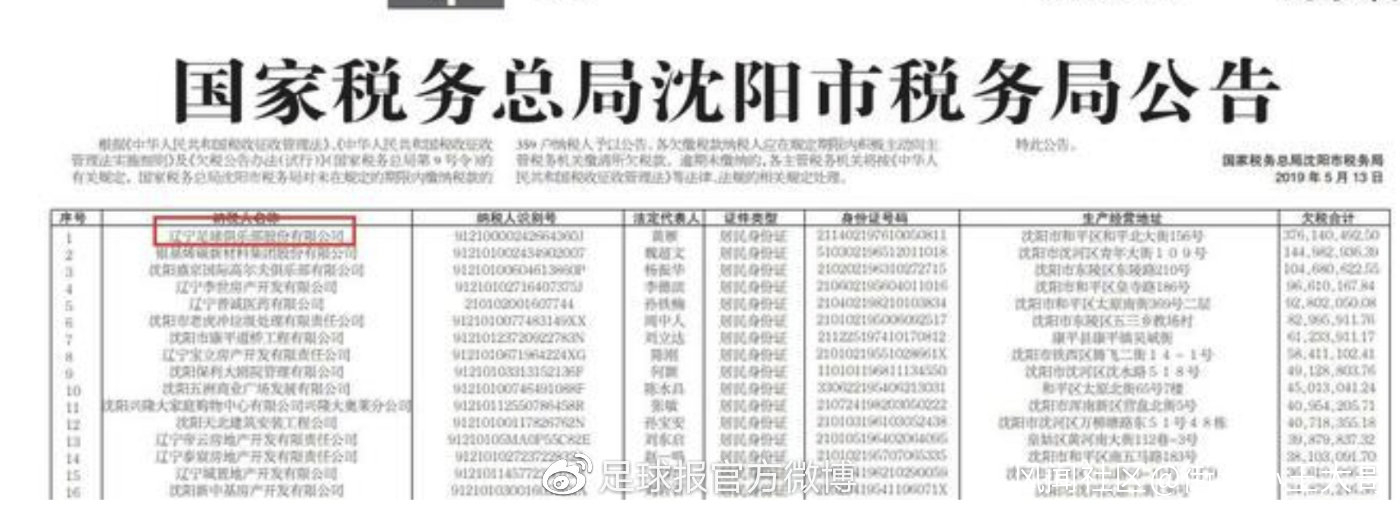 根據《中華人民共和國税收徵收管理法》、《中華人民共和國税收徵收管理法實施細則》及《欠税公告辦法(試行)》(國家税務總局第9號令)的有關規定,國家税務總局瀋陽市税務局對未在規定期限內繳納税款的359户納税人予以公告,並限期各欠繳税款納税人應在規定期限內積極主動向主管税務機關繳清所欠税款。逾期未繳納的,各主管税務機關將按《中華人民共和國税收徵收管理法》等法律、法規的相關規定處理。在這份名單上,遼寧足球俱樂部以欠税376140492.50元人民幣排在首位,欠税比第二名的高出了一倍多。