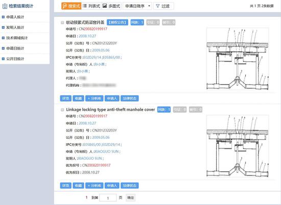 澎湃新聞注意到,2008年10月27日,一名叫孫小果的申請人曾就其發明的聯動鎖緊式防盜窖井蓋申請國家專利。
